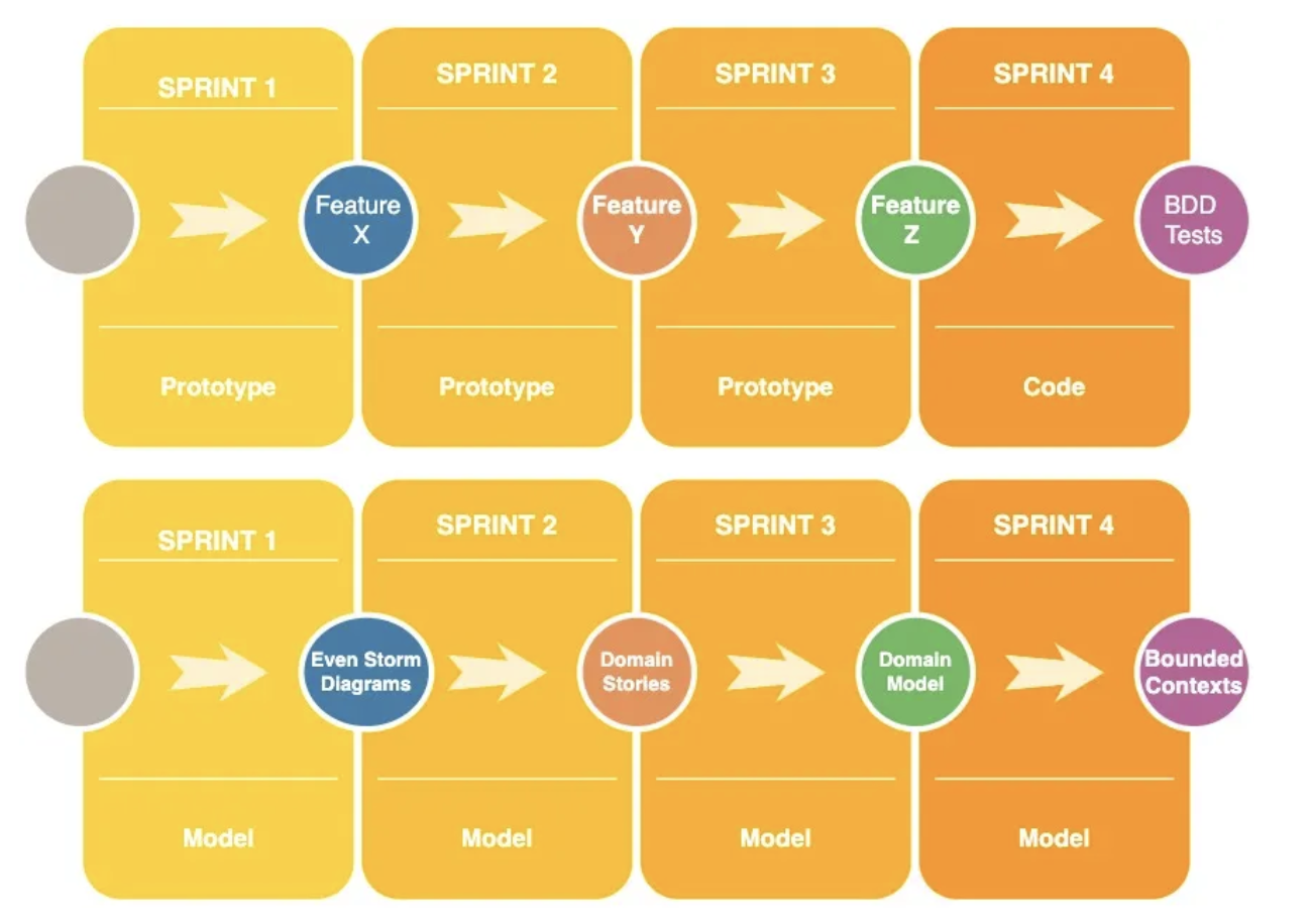 DDD can be used in conjunction with Agile, after all, they are two different things. Agile is a project management methodology, whereas DDD is a set of techniques and approaches to software development. The main point I am trying to make in this blog is: Do not focus on demoing fully working software at the end of each sprint. Instead, you can demo various DDD artifacts that are the product of Knowledge Crunching sessions. For example, you could demo a Domain Story Diagram, an Event Storming sheet, a diagram of Entities in a Domain Model, a Bounded Context Map… All these artifacts can be demoed and reviewed at Sprint Review meetings.